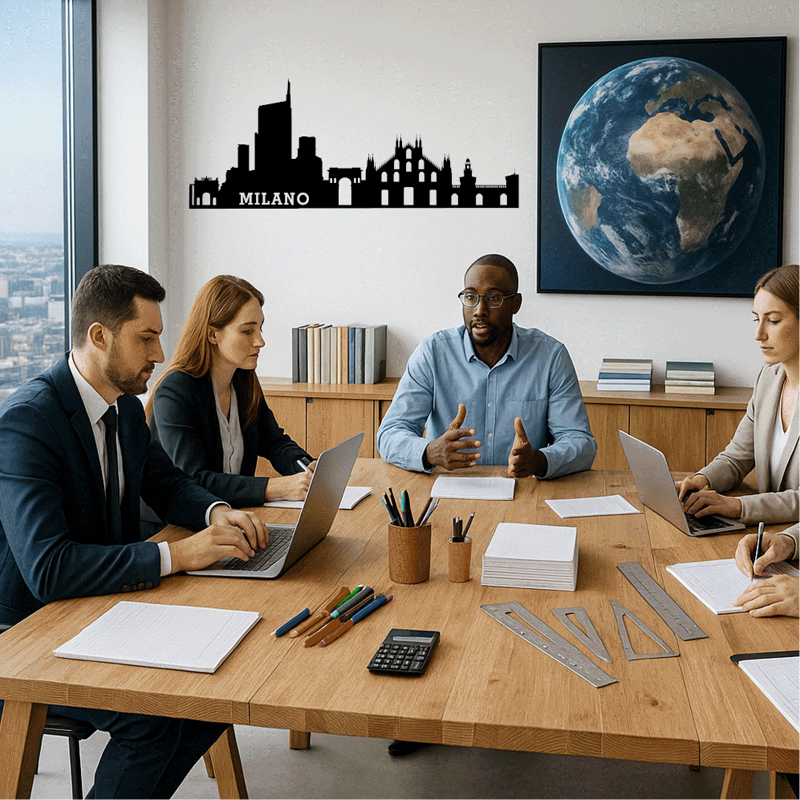 La finitura opaca del vinile valorizza ogni dettaglio dello SKYLINE di MILANO con straordinaria eleganza, rendendo la decorazione protagonista in ambienti speciali ed anche su spazi outdoor.